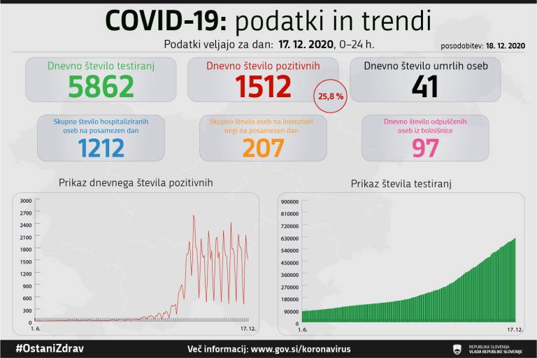 V Sloveniji so včeraj, 17. decembra, opravili 5862 testiranj na koronavirus in potrdili 1512 novih okužb. To pomeni, da je bil delež pozitivnih testov tokrat 25,79-odstoten.