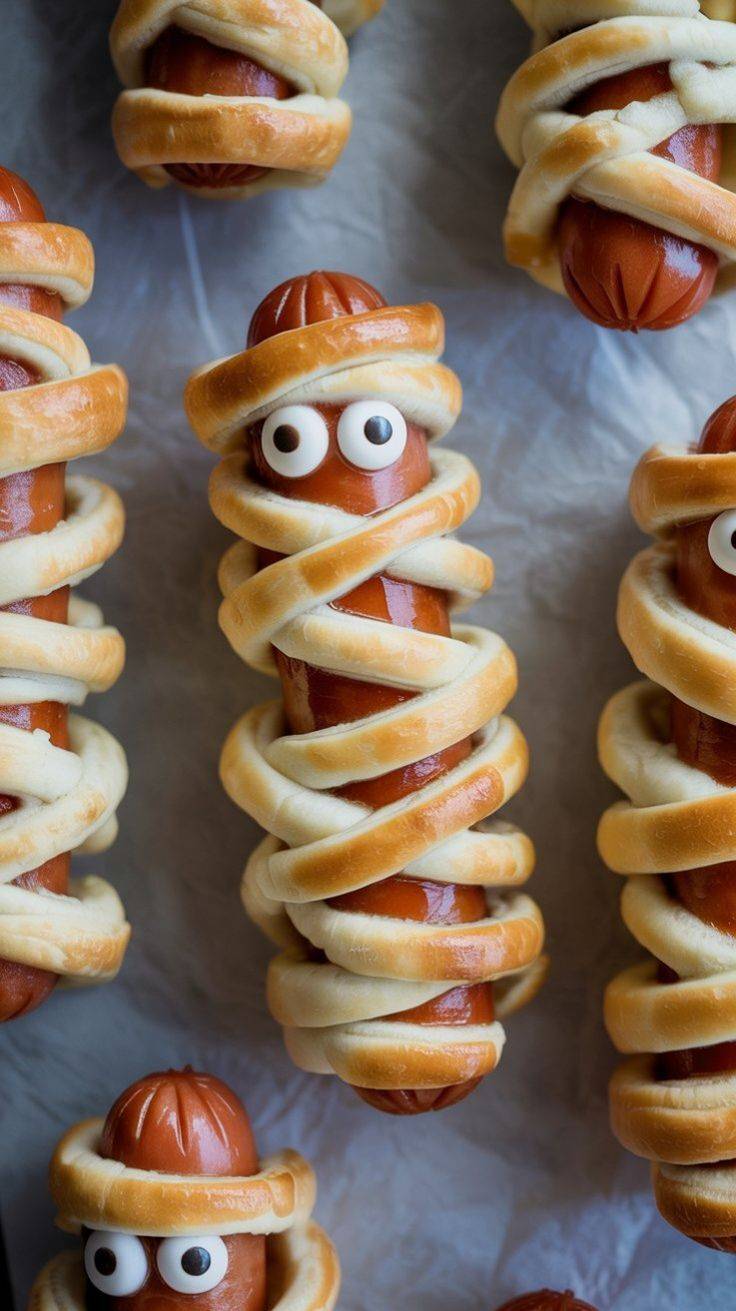 Razvaljajte listnato testo in ga narežite na tanke trakove. Z njimi ovijte hrenovke, tako da pustite majhno režo za oči. Pecite, dokler testo ne postane zlato rjavo in hrustljavo.