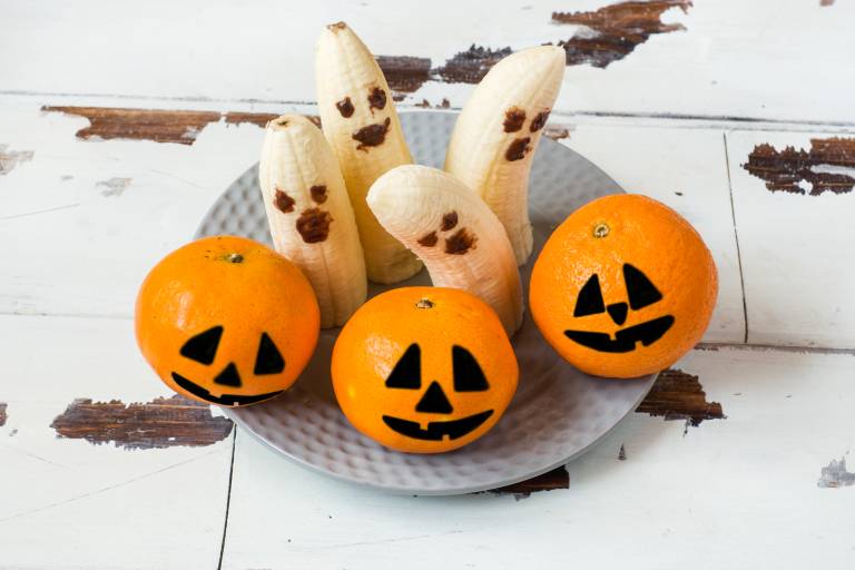Olupite banane in jih prerežite na pol. S stopljeno čokolado narišite oči in odprta usta, kot jih imajo duhci iz risank. Postavite jih pokončno na krožnik in že imate sladke, a srhljive duhce.