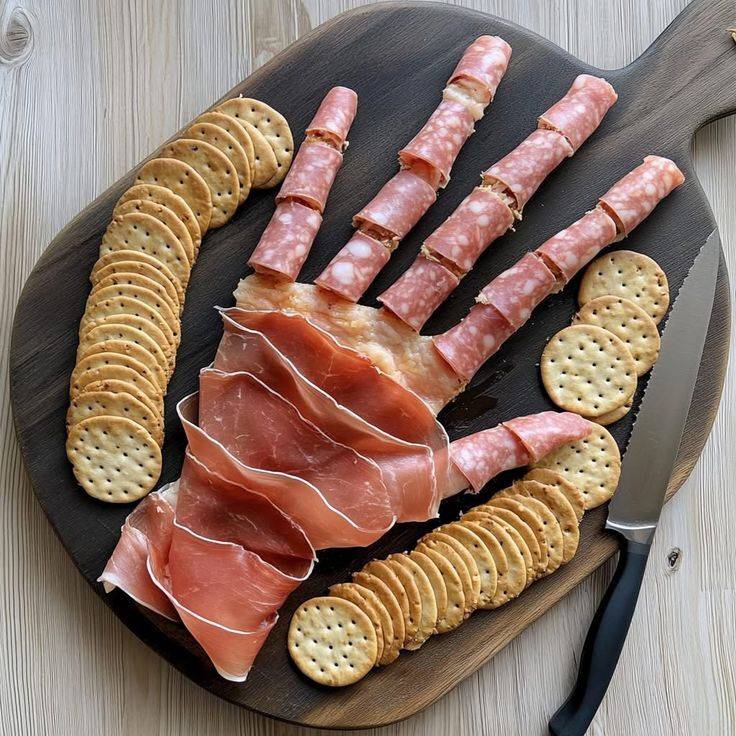 Na servirni deski zložite rezine mesa in sira v obliko roke. Za prste uporabite salame, ki jih zvijete v rolice in nadevate s sirom. Na zapestje dodajte kanček kečapa, da bo roka videti še bolj realistično.