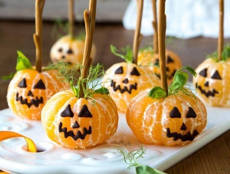 Olupite mandarine in jih nežno obrišite. S stopljeno čokolado ali jedilnim flomastrom narišite oči in strašen nasmešek. V sredino vsake mandarine zataknite Bobi palčko, ki bo služila kot stebelce. Za piko na i dodajte malo mikro zelenja.