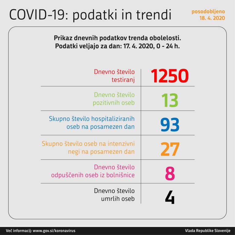 Vlada RS je sporočila, da je bilo včeraj opravljenih 1250 testiranj, pozitivnih primerov je bilo 13. V bolnišnicah je do današnjega dne zaradi koronavirusa 93 oseb, od tega 27 oseb na intenzivni negi. Zabeležili so tudi 8 novih ozdravelih, ki so bili odpuščeni iz bolnišnice, včeraj pa so zaradi koronavirusa umrle 4 osebe.