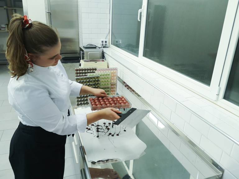 »Postopek izdelave bonbonov je precej kompleksen Najpomembnejši faktor pri čokoladi je temperatura. Na kratko pa gre takole: najprej kalup pobarvam z obarvanim kakavovim maslom; vlijem čokolado, da nastane lupinica; napolnim z enim, dvema ali tremi polnili; pustim, da se polnilo kristalizira minimalno 12 ur in na koncu še zaprem s čokolado. Zelo pomemben del so seveda tudi kvalitetne surovine. Uporabljam najboljšo belgijsko in francosko čokolado in najboljše francoske sadne pireje polnega okusa.