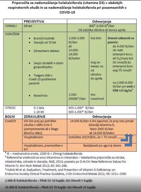 Potrebe odraslega so od 800 do 1000 internacionalnih enot, v primeru pomanjkanja pa 4000 internacionalnih enot za obdobje najmanj dveh mesecev, nato 1000 internacionalnih enot. V času respiratornih okužb, tveganju za covid-19 in vsem, ki so s pozitivnimi v stiku, se svetujejo višji odmerki, in sicer 2000 do 4000 internacionalnih enot, še poudarja Potočnik Benčič.