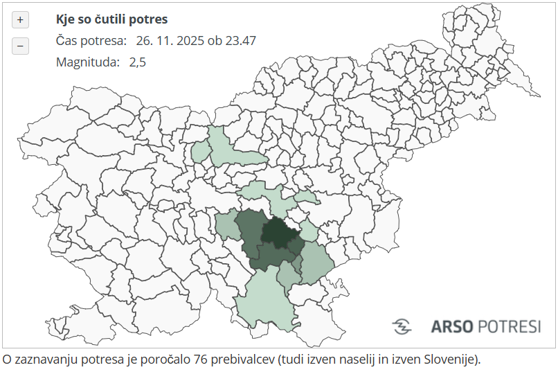 V sredo pozno zvečer, 26. novembra 2025, ob 23.47, so seizmografi državne mreže potresnih opazovalnic zabeležili potres magnitude 2,5