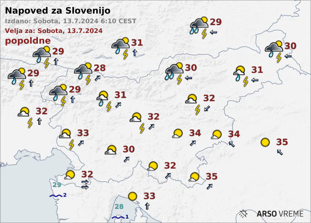 V zahodni, južni in osrednji Sloveniji bo povečini pihal jugozahodni veter, drugod severovzhodnik. Najvišje dnevne temperature bodo od 28 do 33, na jugovzhodu do 35 °C.