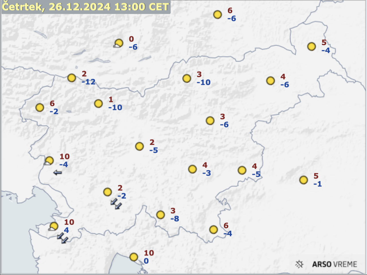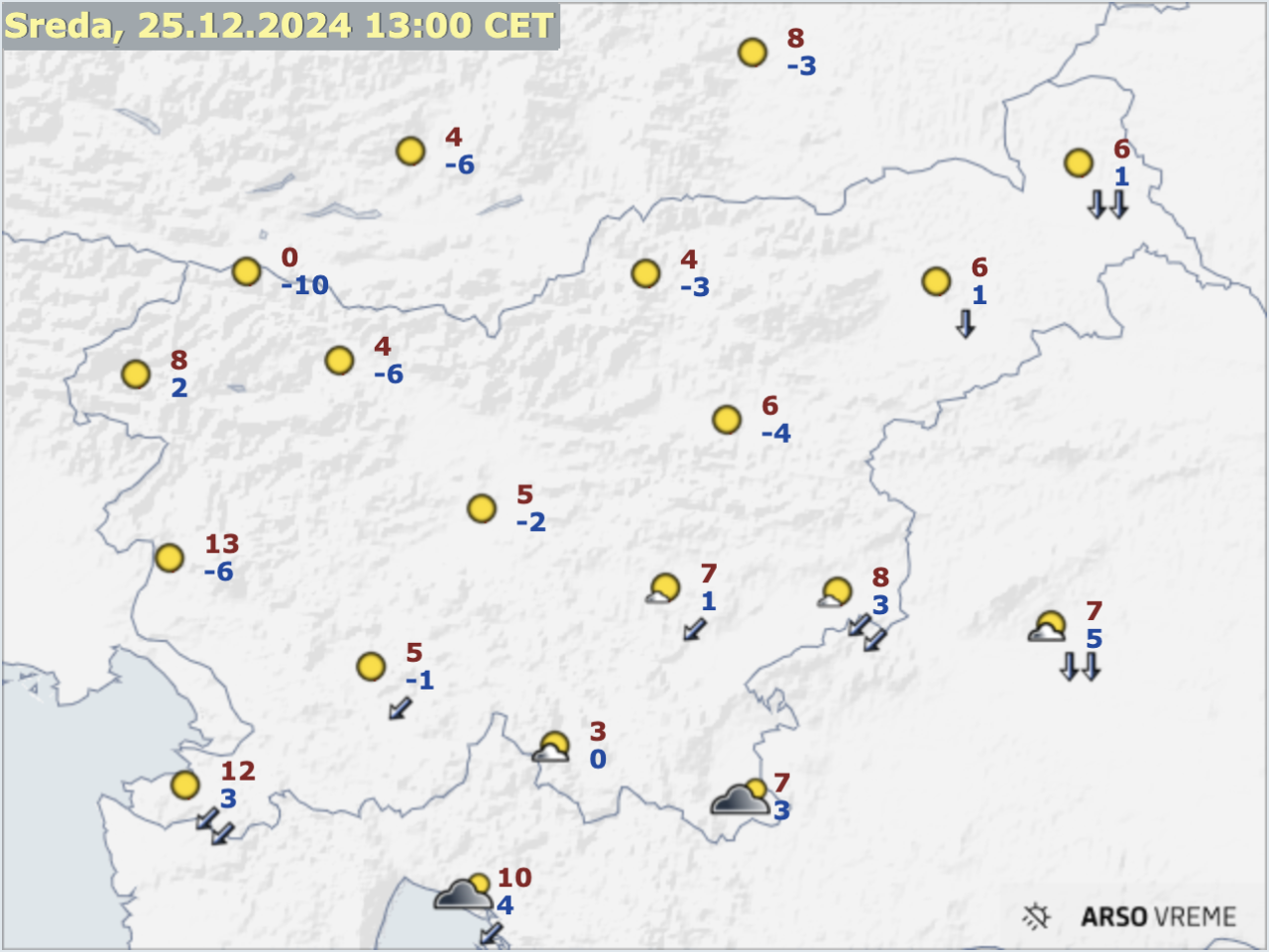 Danes bo na vzhodu sprva še nekaj več oblačnosti, čez dan se bo povsod razjasnilo. Na severovzhodu in vzhodu bo še pihal veter severnih smeri, na Primorskem pa šibka do zmerna burja. Najvišje dnevne temperature bodo od 1 do 8, na Primorskem do 13 °C.