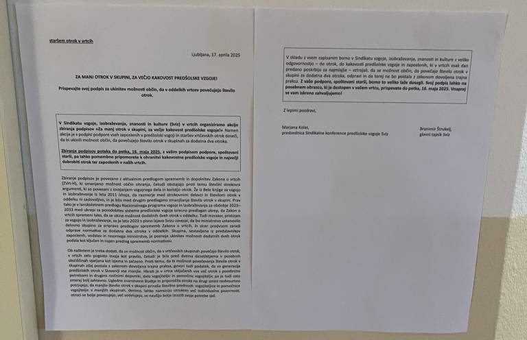Zbiranje podpisov med zaposlenimi v vrtcih in starši bo trajalo do 16. maja 2025.