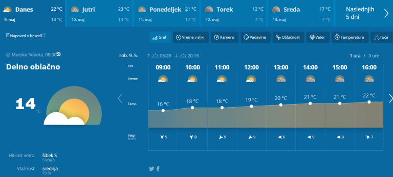 Danes bo večinoma sončno, občasno bo ponekod nekaj več oblačnosti. Čez dan bo spet zapihal jugozahodni veter, v Prekmurju in deloma na Štajerskem pa jugovzhodnik. Najvišje dnevne temperature bodo od 22 do 26 °C.