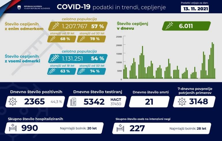 V Sloveniji so včeraj, 13. novembra, opravili 5342 PCR testiranj na koronavirus in potrdili 2365 novih okužb, gre za 44,3-odstotni delež okužb.
