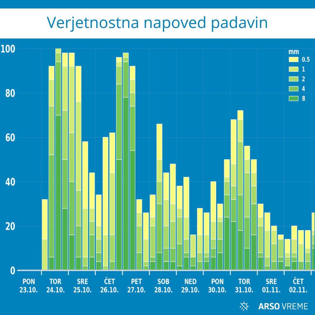 »Čaka nas obdobje spremenljivega vremena s pogostimi padavinami,« napovedujejo metorologi Agencije za okolje: »Od jutri naprej do nadaljnjega obstaja vsaj majhna verjetnost za pojav padavin.«