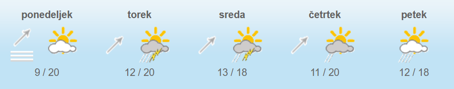 Najnižje jutranje temperature bodo od 11 do 16, v alpskih dolinah severne Slovenije okoli 10, najvišje dnevne od 16 do 23, v Gornjesavski dolini okoli 13 stopinj Celzija.