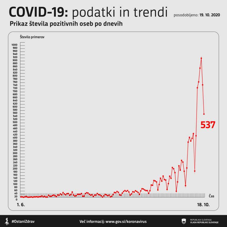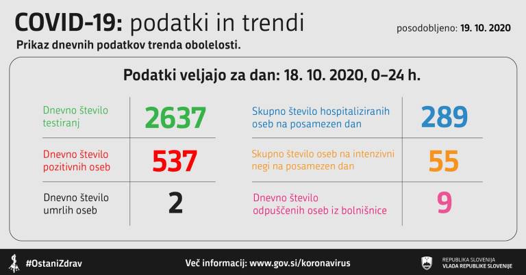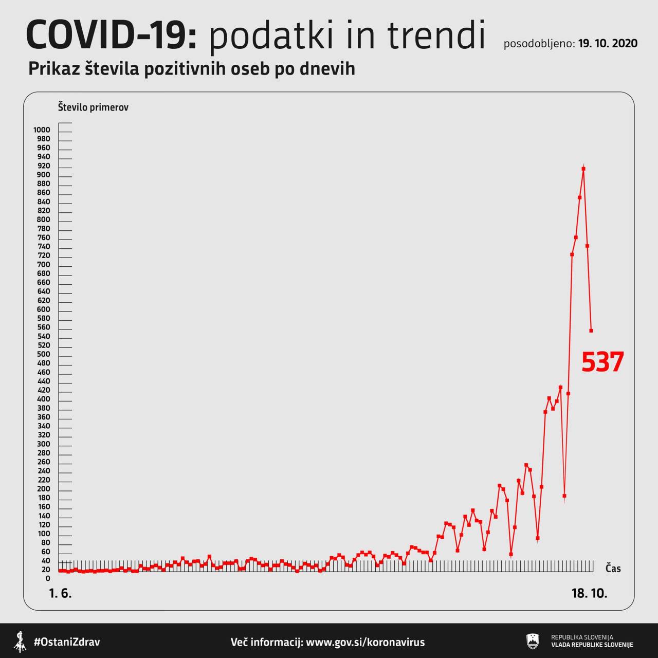 V Sloveniji smo v nedeljo, 18. oktobra, opravili 2637 testiranj na koronavirus in potrdili 537 novih okužb, delež pozitivnih je bil 20,36 odstoten. Incidenca v Sloveniji je trenutno 339 okuženih v zadnjih 14-dneh na 100.000 prebivalcev.