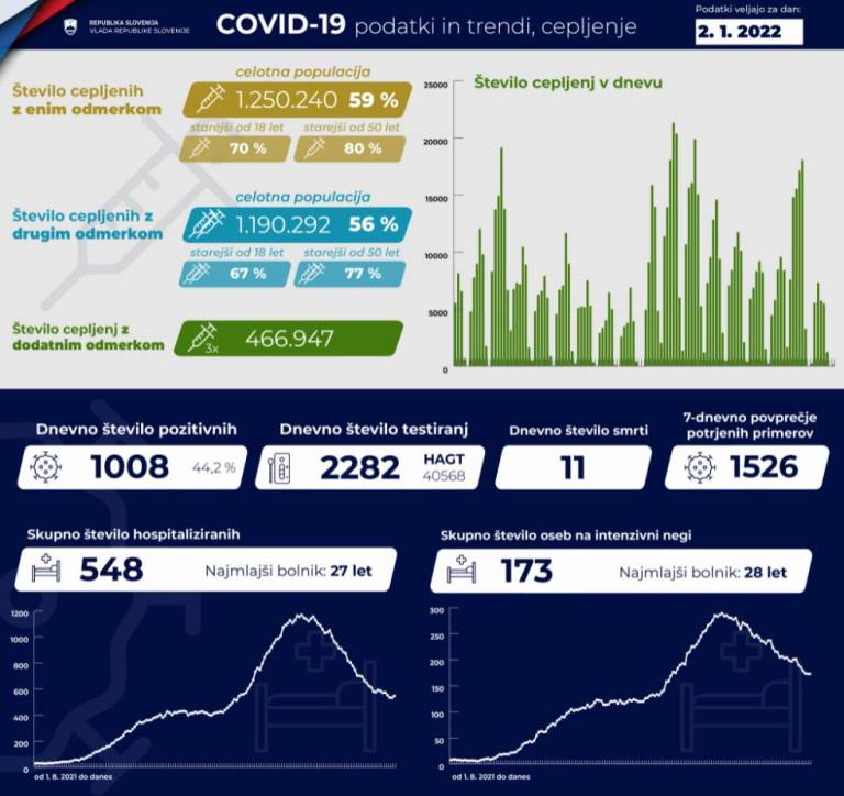 V Sloveniji so včeraj, 2. januarja, opravili 2282 PCR testiranj na koronavirus in potrdili 1008 novih okužb, gre za 44,2-odstotni delež okužb.