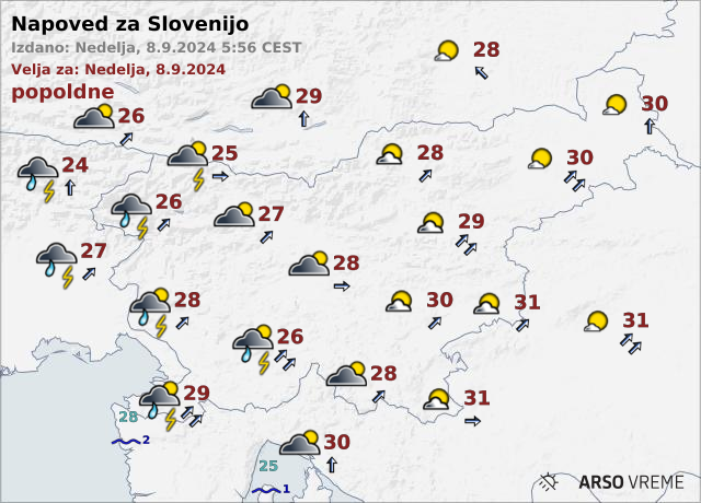 Danes popoldne bodo na zahodu krajevne padavine in nevihte, ki se bodo zvečer okrepile in širile proti vzhodu, napoveduje Agencija Republike Slovenije za okolje. Jutri bo spremenljivo s plohami in nevihtami.