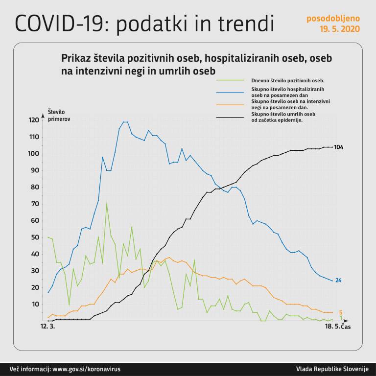 Dan je minil brez novih smrtnih žrtev zaradi covid-19. Skupno število umrlih zaradi covid-19 v Sloveniji ostaja pri 104 smrtnih žrtvah.