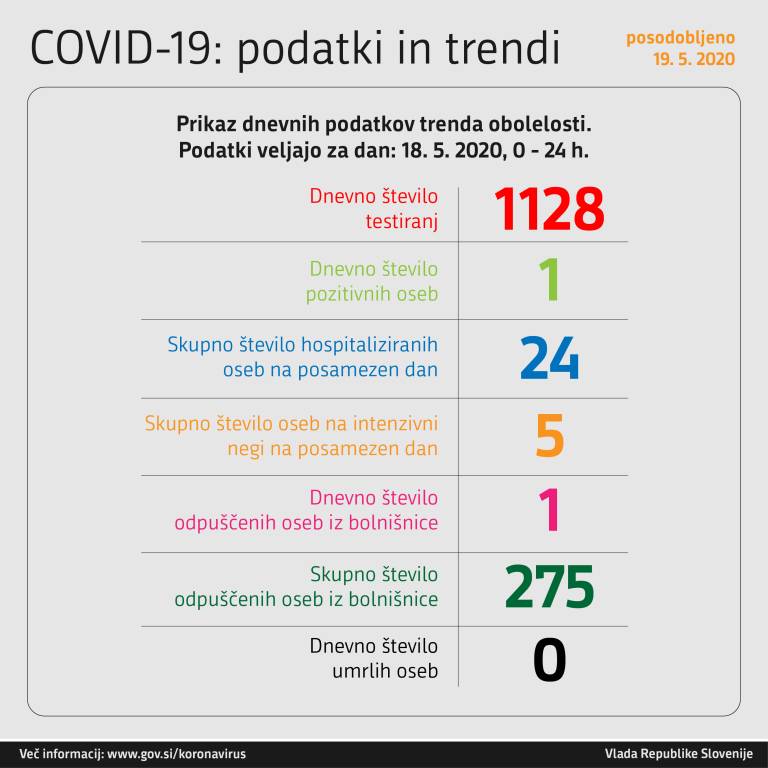Po zadnjih podatkih, ki jih je sporočil državni vrh, je bilo včeraj v štirindvajsetih urah opravljenih 1128 testiranj, od tega je bila ena oseba pozitivna na koronavirus. Doslej smo v Sloveniji zabeležili 1467 primerov koronavirusa.
