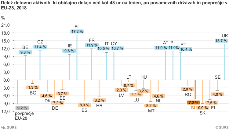 To nas je v mednarodni primerjavi uvrstilo pod evropsko povprečje, ki znaša 9 odstotkov. Najnižji delež delovno aktivnih, ki so opravili toliko ur, je imela Litva – manj kot odstotek. Najvišji delež delovno aktivnih, ki tedensko delajo vsaj 49 ur, je lani imela Grčija.