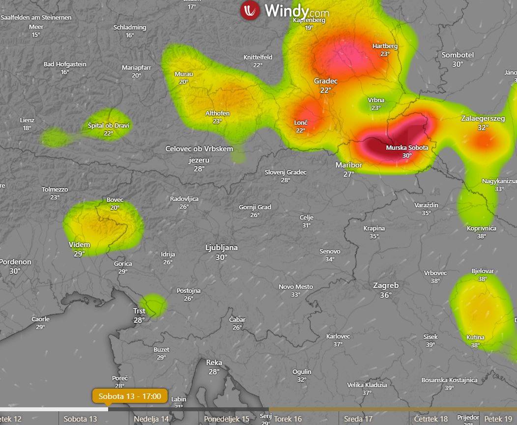 Windy, aplikacija za napovedovanje in vizualizacijo vremena, napoveduje, da bodo predvsem na severu in severovzhodu države, v popoldanskem času možna krajevna neurja.