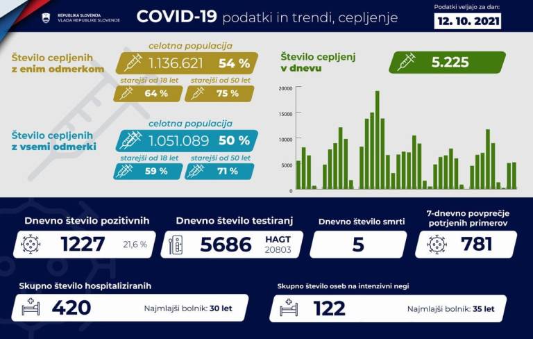 V Sloveniji so včeraj, 12. oktobra, opravili 5686 PCR testiranj na koronavirus in potrdili 1227 novih okužb, gre za 21,6-odstotni delež okužb.
