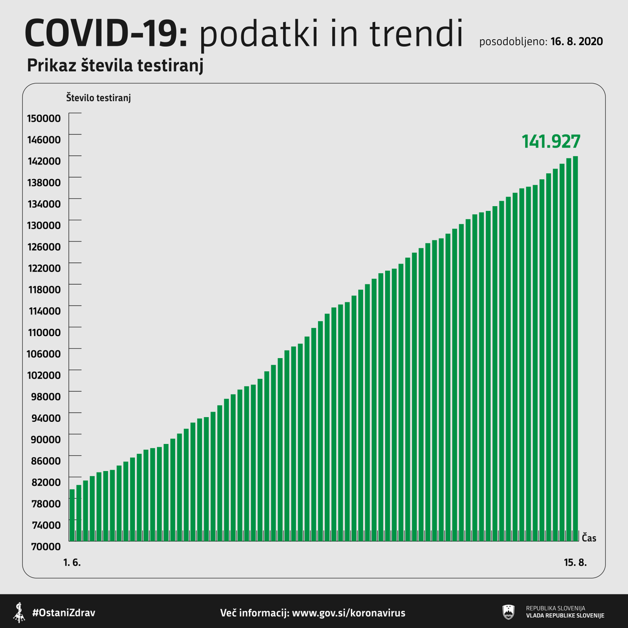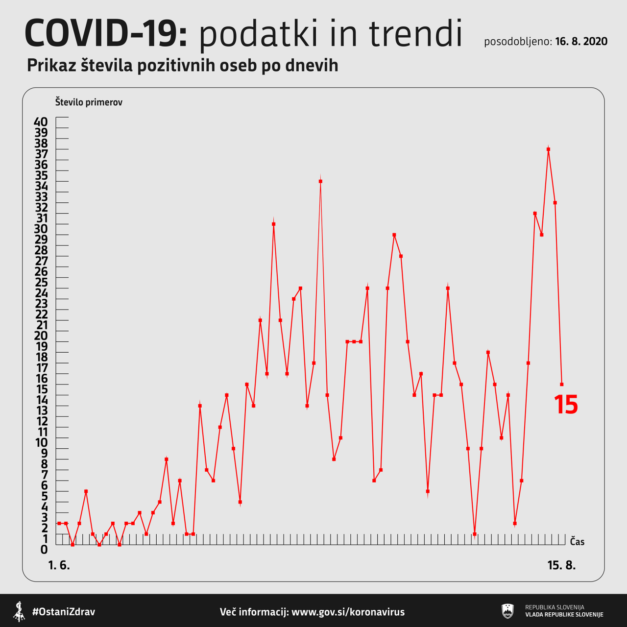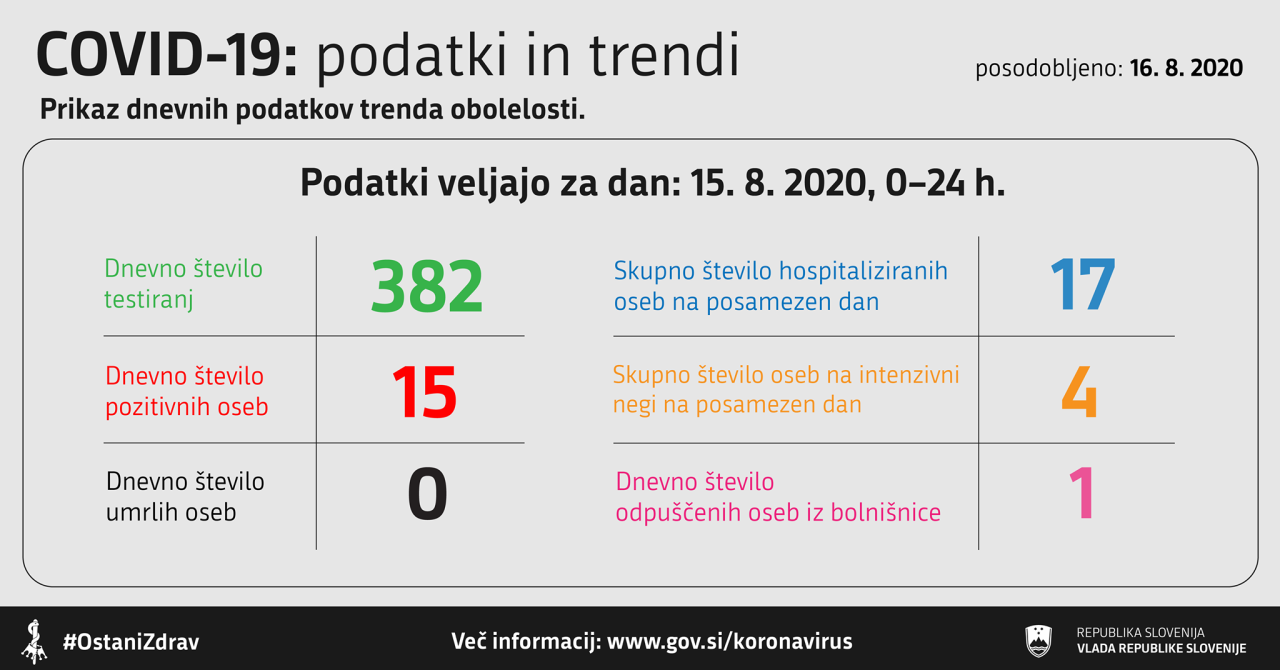 Včeraj, 15. avgusta 2020, so v Sloveniji opravili 382 testiranj na novi koronavirus. Potrdili so 15 novih okužb s koronavirusom.
