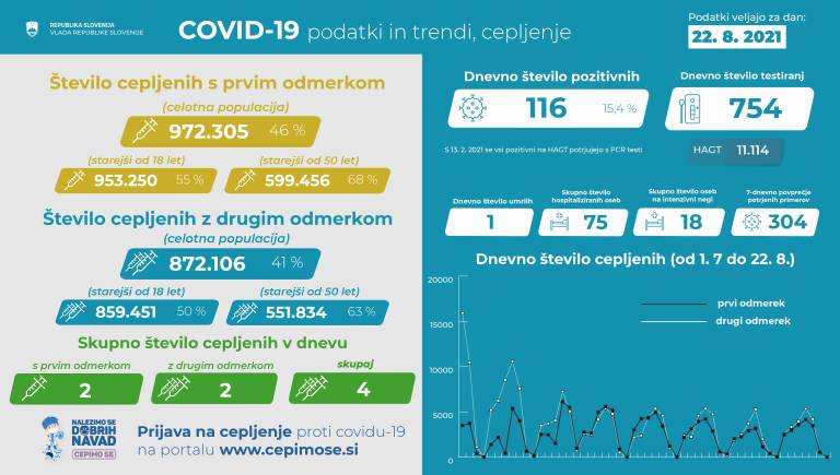 V Sloveniji so včeraj, 22. avgusta, opravili 754 PCR testiranj na koronavirus in potrdili 116 novih okužb, gre za 15,4-odstotni delež okužb.
