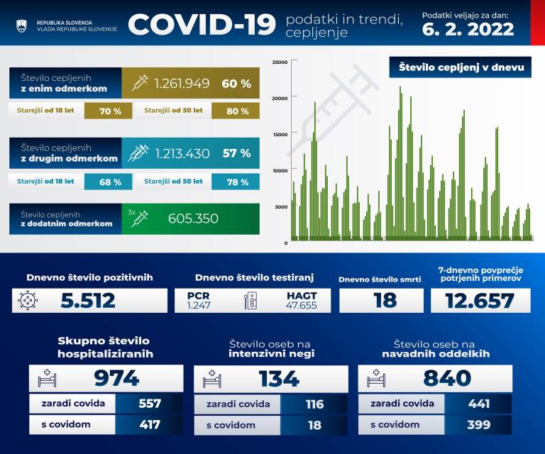 Po zadnjih podatkih je zaradi covida hospitaliziranih 557 bolnikov, s covidom oziroma drugih bolezni pa 417 bolnikov.