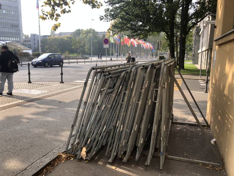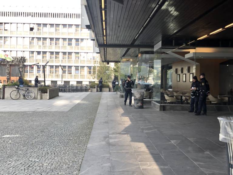 14.25 - Policija je pripravljena na Slovenski cesti. Tam stoji več policijskih avtomobilov. Na Trgu republike, ki je zagrajen, stoji ogromen šotor. Protestnikov ali mimoidočih tam ni, je pa ogromno policistov.