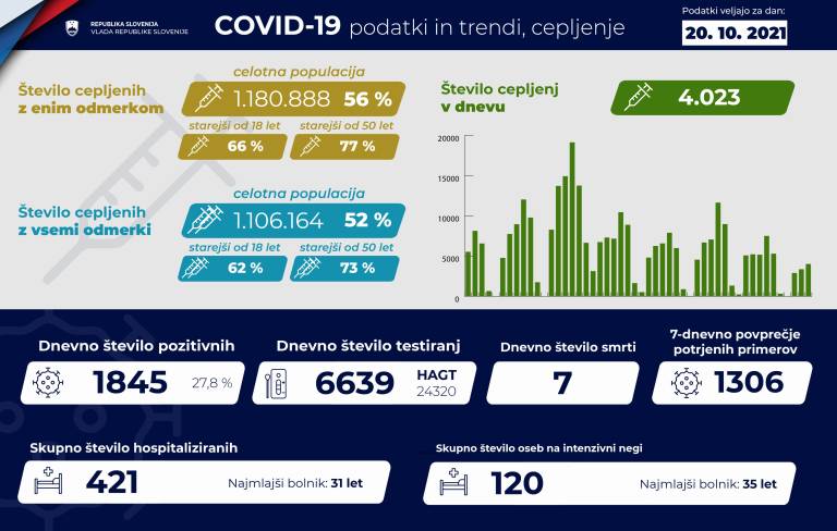 V Sloveniji so včeraj, 20. oktobra, opravili 6639 PCR testiranj na koronavirus in potrdili 1845 novih okužb, gre za 27,8-odstotni delež okužb. Povprečje okuženih v zadnjem tednu je 1306.
