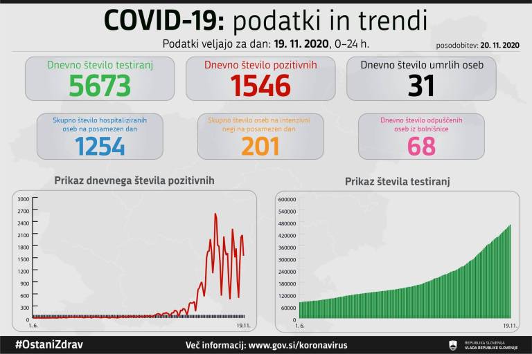 V Sloveniji so v včeraj, 19. novembra, opravili 5673 testiranj na koronavirus in potrdili 1546 novih primerov okužbe. Delež pozitivnih testov je bil tako nekoliko nižji kot dan pred tem in je znašal 27,25 odstotka.