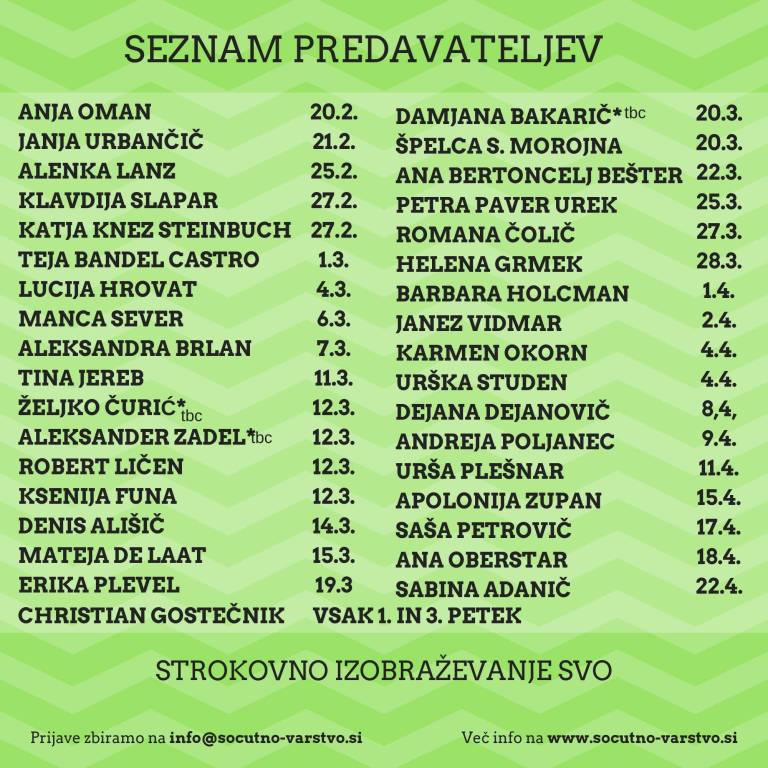 Aleksander Zadel, Katja Knez Steinbuch, Željko Čurič, Christian Gostečnik, Andreja Poljanec, Ana Bešter Bertoncelj in mnogi drugi so del SVO izobraževanj.