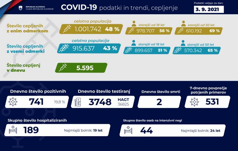 V Sloveniji so včeraj, 3. septembra, opravili 3748 PCR testiranj na koronavirus in potrdili 741 novih okužb, gre za 19,8-odstotni delež okužb.