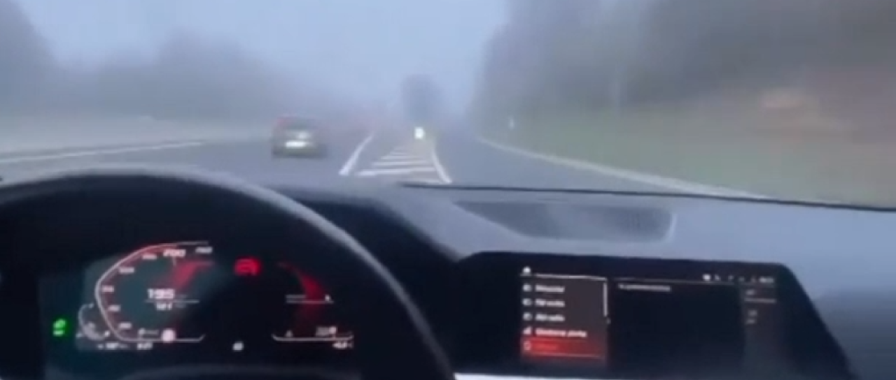 Voznik po avtocesti drvi z nenormalno hitrostjo v slabo vidljivem vremenu.