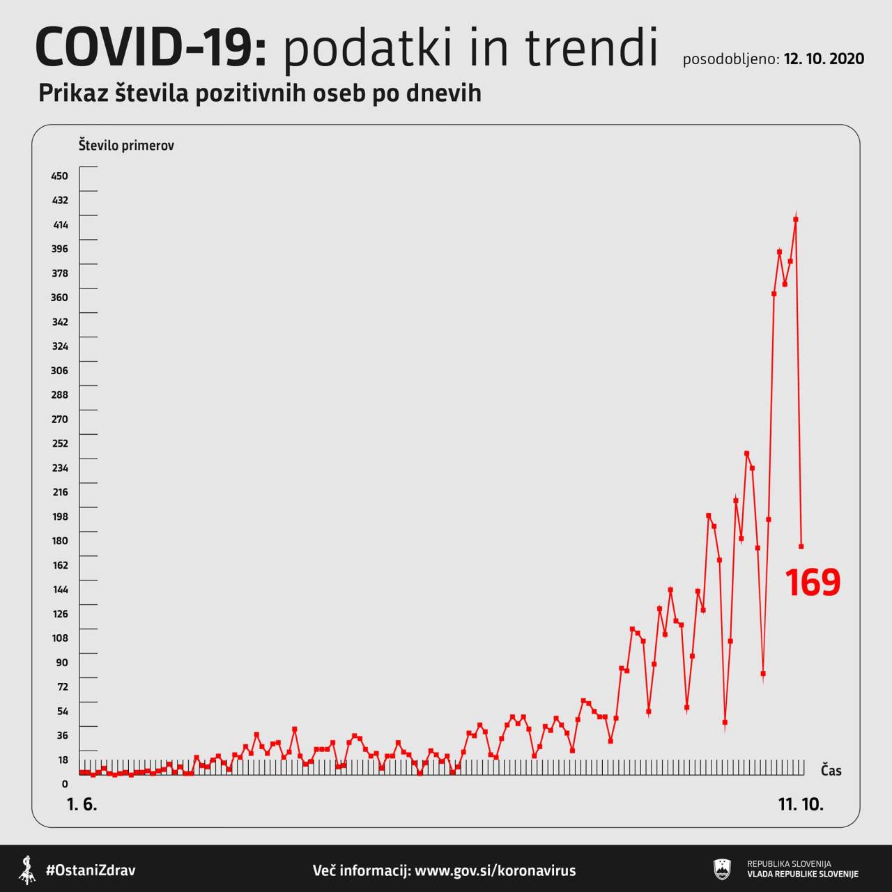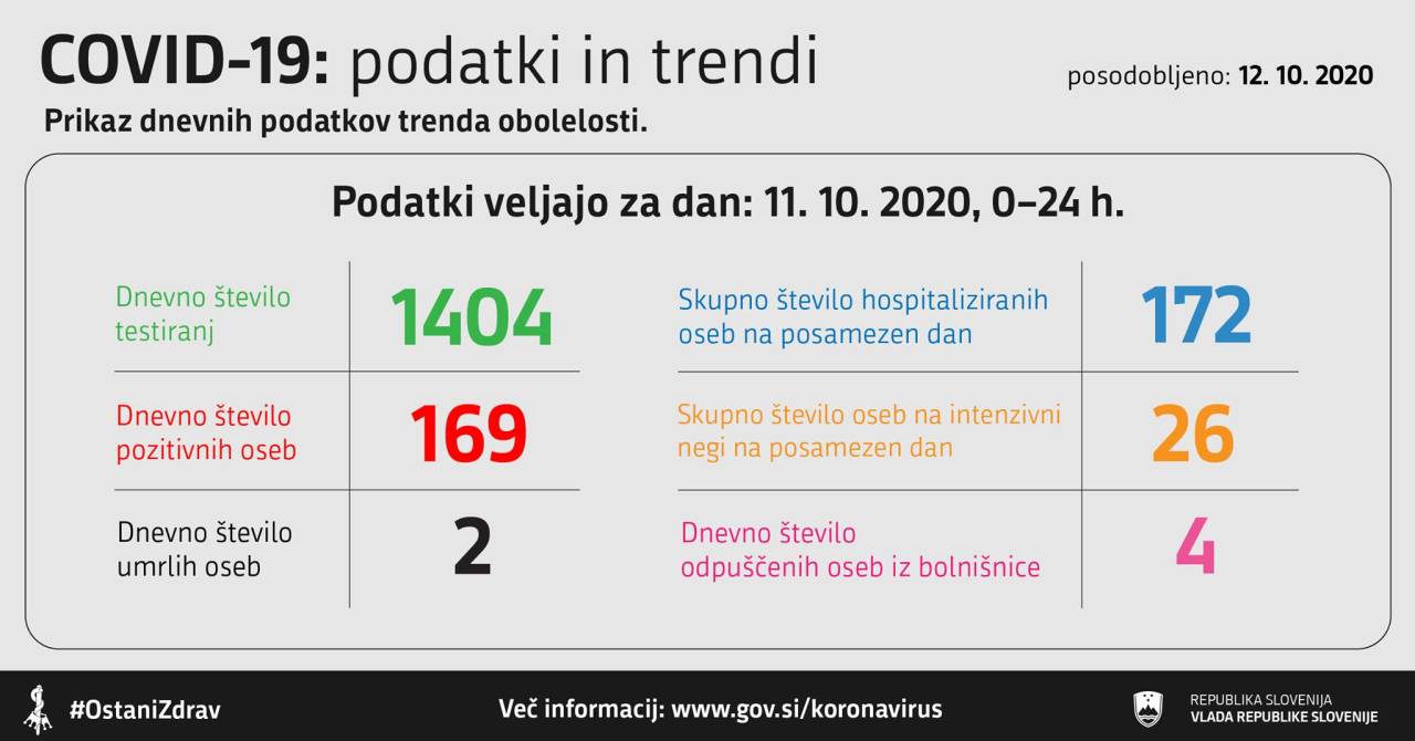 V Sloveniji so v nedeljo, 11. oktobra, opravili 1404 testiranj na koronavirus. Potrdili so 169 novih okužb. Skupno število vseh doslej potrjenih okužb s koronavirusom v Sloveniji zdaj znaša 8830. Vladni govorec Jelko Kacin je ob svežih podatkih o trendu obolelosti s koronavirusom izpostavil še, da je delež pozitivnih testov 12-odstoten.