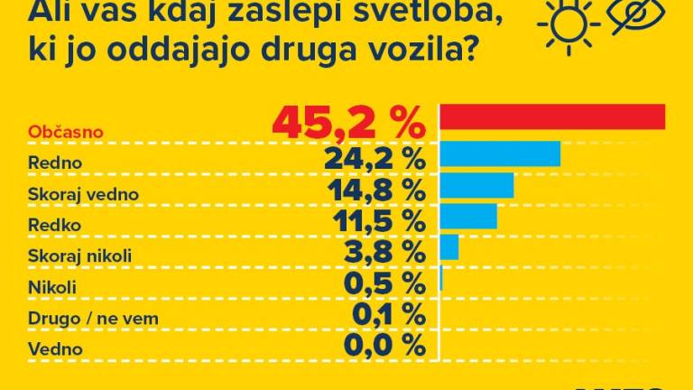 Več kot polovica vprašanih (55,8 odstotka) opaža težave z bleščanjem predvsem pri slabi vidljivosti, kamor štejejo na primer tema, megla, močno deževje ali sneženje. A več kot četrtina vprašanih (25,4 odstotka) enake težave občuti tudi pri zmanjšani vidljivosti, v katero štejemo nizko sonce, bleščanje sonca ali mrak.