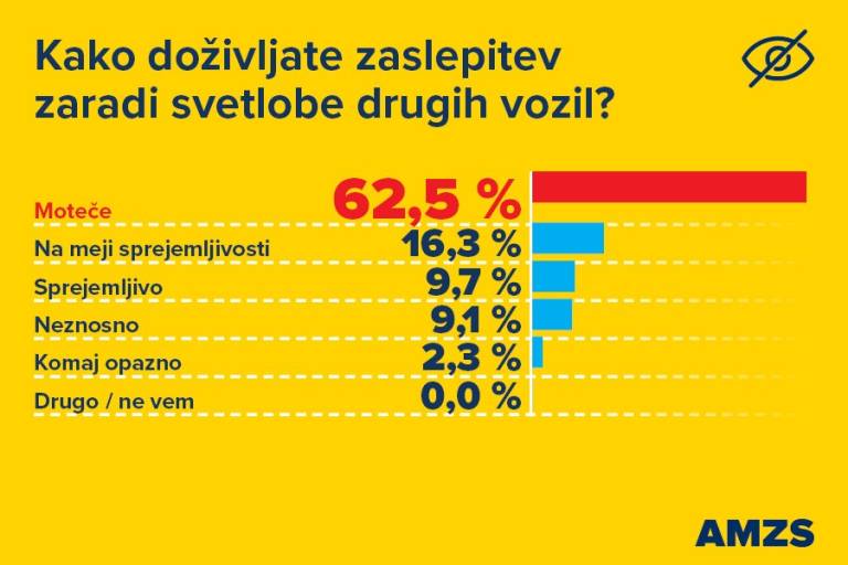 Zaslepljenost med vožnjo je za voznike lahko zelo neprijetna, kar so potrdili tudi odgovori na vprašanje: kako doživljate zaslepitev zaradi svetlobe drugih vozil? Šest od desetih voznikov (62,5 odstotka) vprašanih je v raziskavi AMZS navedlo, da je takšno bleščanje moteče, 16,3 odstotka jih meni, da je na meji sprejemljivosti, devet odstotkom vprašanih pa se bleščanje žarometov zdi neznosno. Le deset odstotkov vprašanih meni, da je tovrstno bleščanje sprejemljivo.