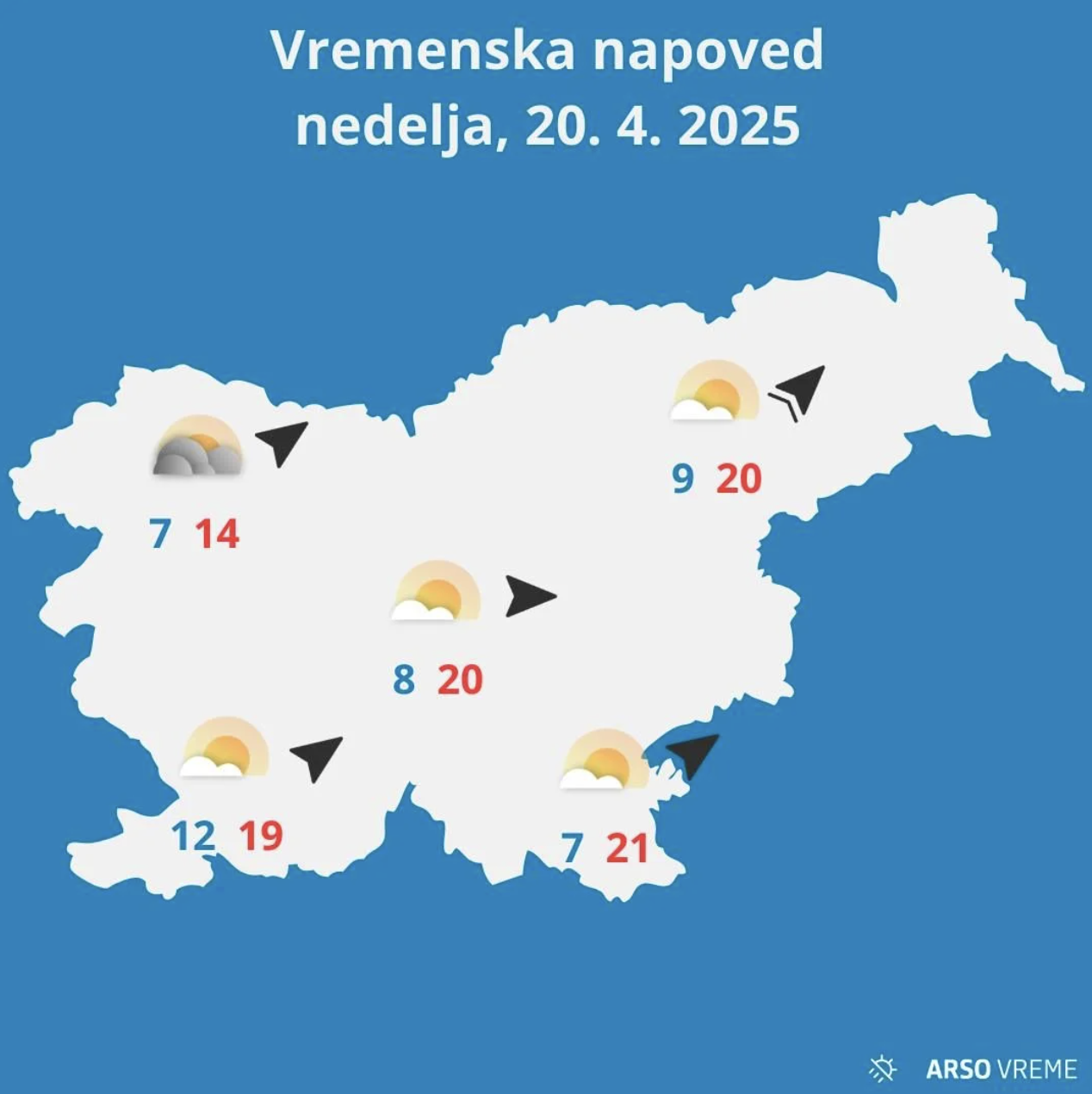 Danes nas čaka večinoma sončno vreme, le na zahodu bo pretežno oblačno z možnimi občasnimi plohami, ki bodo pogostejše v hribovitem svetu. Pihal bo jugozahodni veter, najvišje dnevne temperature pa se bodo gibale med 14 in 19 stopinj, na vzhodu pa bodo termometri lahko pokazali do 21 stopinj Celzija.