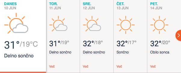 Popoldne bo povečini sončno, na zahodu občasno zmerno oblačno, predvsem v gorskem svetu nastane kakšna vročinska nevihta. Pihal bo šibak veter vzhodne do južne smeri. Najvišje dnevne temperature bodo od 29 do 33 stopinj Celzija.