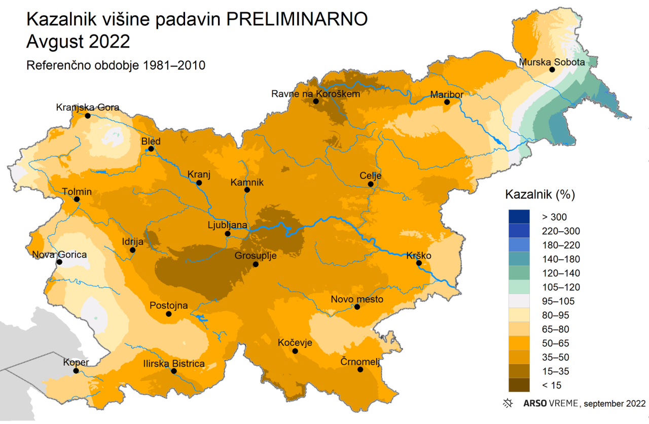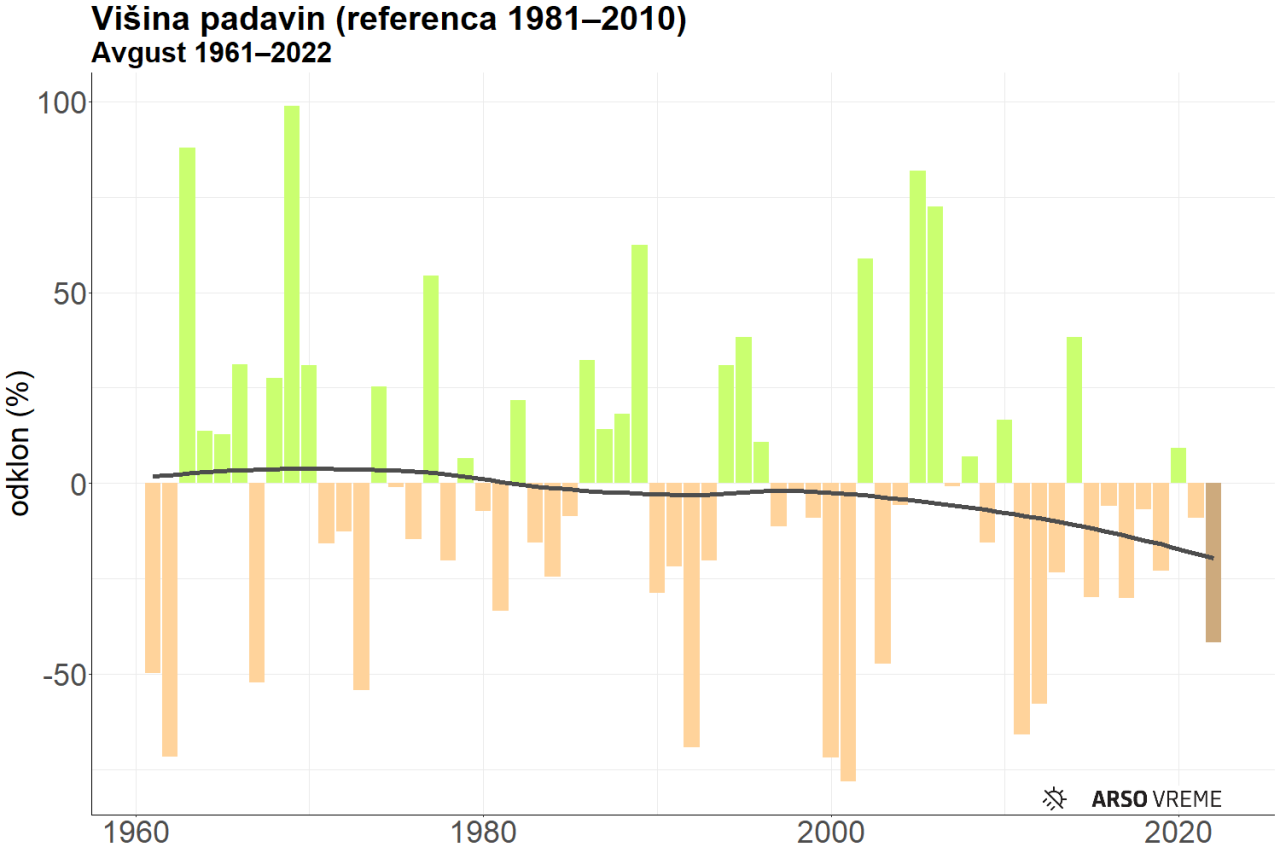 Avgust je bil na ravni celotne države namočen močno podpovprečno. Kazalnik višine padavin je na državni ravni znašal okrog 58 odstotkov, kar uvršča avgust 2022 med enajst najbolj sušnih od leta 1961.