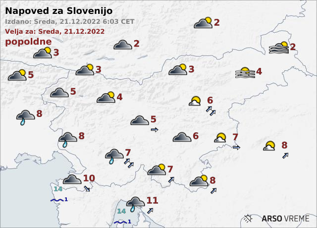 Prvi zimski dan bo na vzhodu in severu Slovenije vreme delno jasno, a po nižinah predvsem dopoldne marsikje megleno. Drugod bo večinoma oblačno.