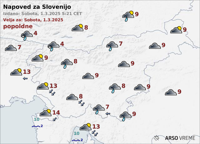 Danes bo večinoma oblačno, pojavljale se bodo rahle padavine, ponekod nad 800 metri bi še lahko snežilo. Nato se bo v nedeljo čez dan razjasnilo, ponekod bo vetrovno, prihodnji teden pa se že obeta vse toplejše spomladansko vreme.