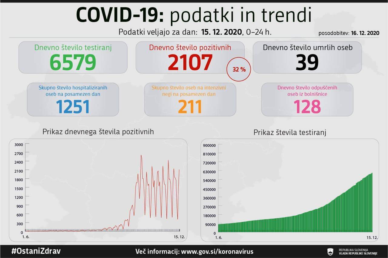V Sloveniji so včeraj, 15. decembra, opravili 6579 testiranj na koronavirus in potrdili 2107 novih okužb. To pomeni, da je bil delež pozitivnih testov tokrat 32-odstoten.