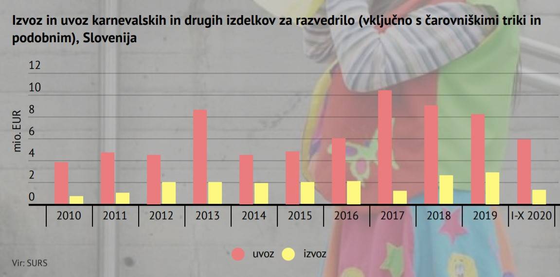 Prav tako so na statističnem uradu pregledali, koliko uvažamo in izvažamo raznih karnevalskih izdelkov, ki so obvezna oprava pustnega časa. Ugotovili so, da je vrednost uvoza karnevalskih in drugih izdelkov za razvedrilo, vključno s čarovniškimi triki in podobnim, v vseh letih od 2000 naprej močno presegala vrednost izvoza.