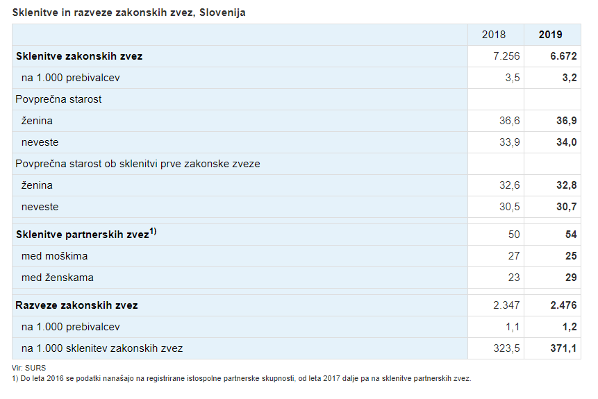 Za nekaj manj kot 89 odstotkov nevest in prav tako 89 odstotkov ženinov je bila lani sklenjena zakonska zveza prva. V nekaj več kot 82 odstotkih je bila to tudi prva zakonska zveza za oba novoporočenca. Ženini, ki so se poročali prvič, so bili stari povprečno 32,8 leta; neveste, ki so se poročale prvič, pa povprečno dve leti mlajše.