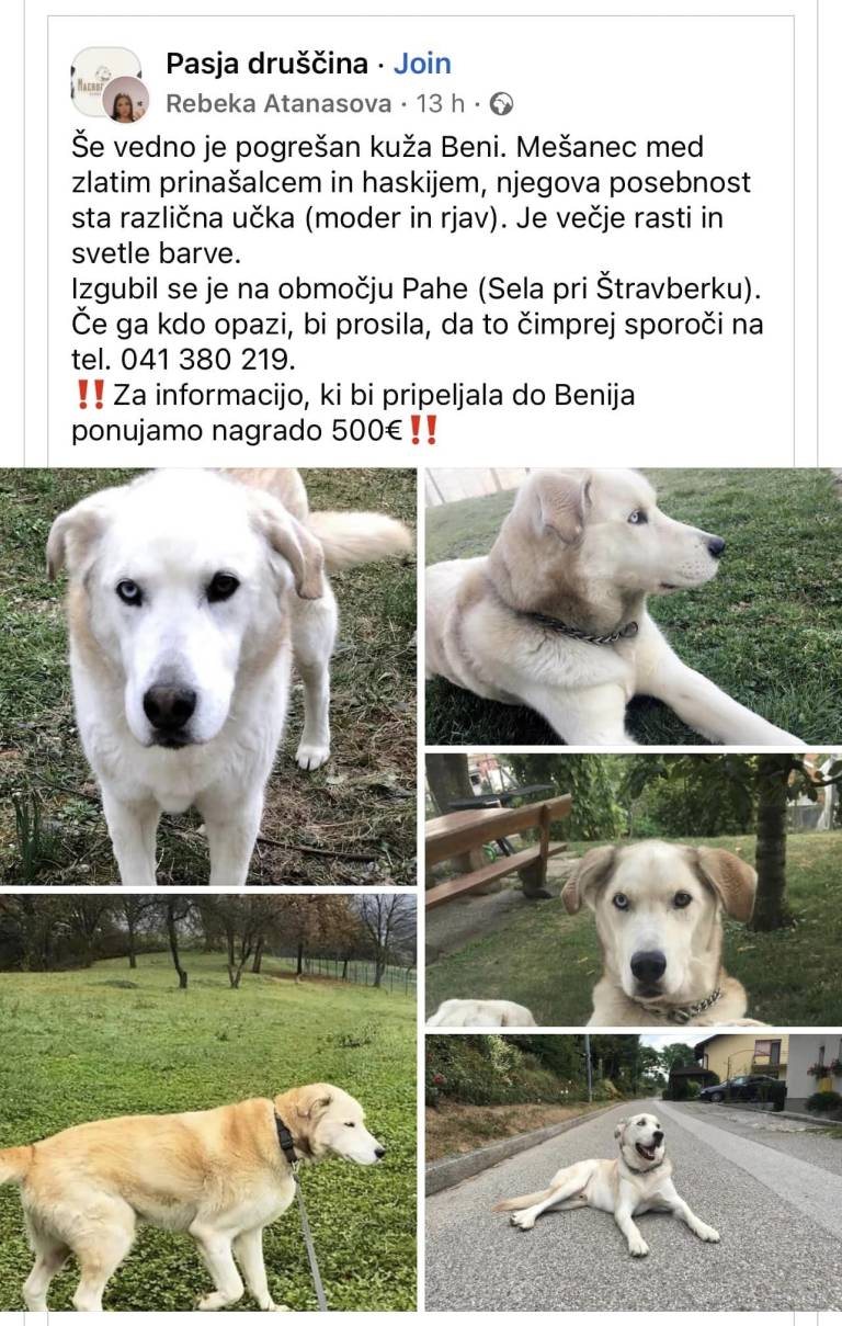 V Facebook skupini Pasja druščina pozivajo na pomoč pri iskanju izgubljenega kužka Benija, mešanca med zlatim prinašalcem in haskijem, za katerega lastniki podarjajo celo denarno nagrado v višini 500 evrov.