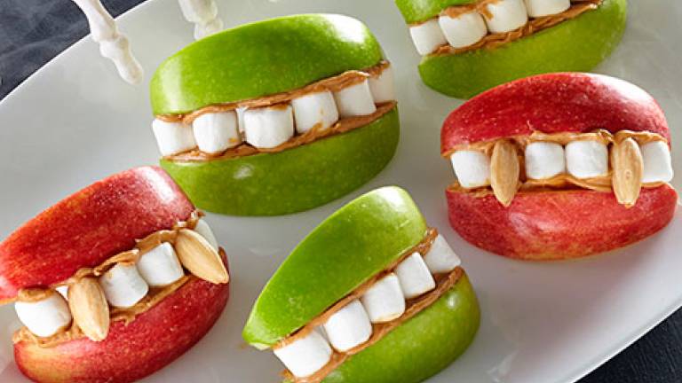 - Korak: Med dva krhlja nanizajte mini penice, tako da bodo videti kot zobje. Med penice lahko nanizate tudi dva arašida in tako naredite tudi vampirski ugriz. Strašno.