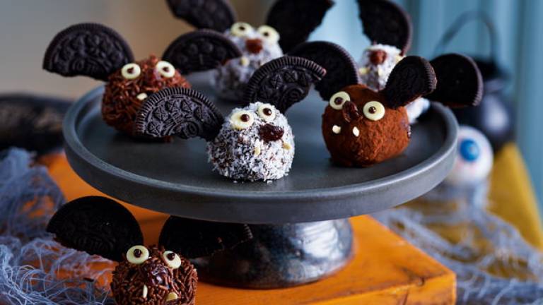 - Korak: Oreo piškote razpolovimo na dva posamezna piškota, tako dobimo dvanajst piškotov. Vsak piškot previdno zlomimo na pol. Ena polovica predstavlja eno netopirjevo krilo, po dve krili namestimo na čokoladne kroglice.