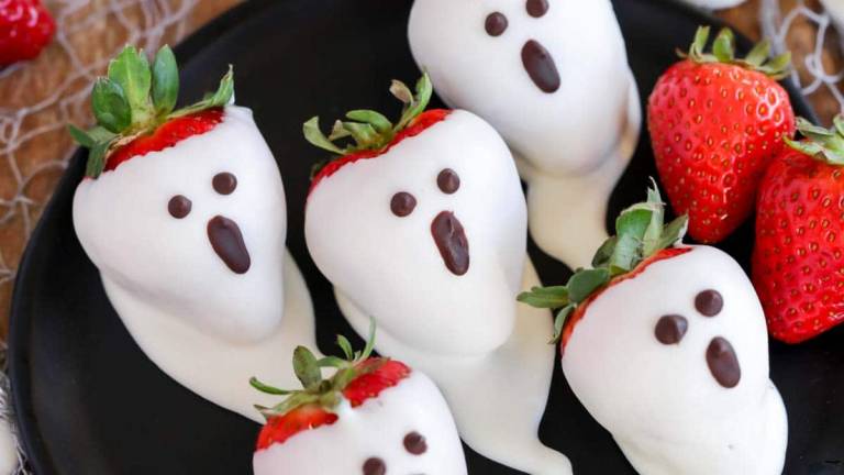 - Jagode potopimo v belo čokolado in jih odložimo na peki papir in jih damo v hladilnik. Ko se bela čokolada strdi, jagode okrasimo še s temno čokolado. Narišemo jim oči in usta in pred nami se pojavijo prisrčni duhci. UUuUuu~~