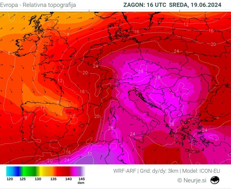 »Na fotografiji je lepo vidna advekcija vročega afriškega zraka, kot posledica višinskega jedra nad Iberskim polotokom. Če se ta napoved in pozicioniranost zračnih mas uresniči, lahko pričakujemo temperature krepko nad 30 stopinj Celzija. V delih Madžarske in Srbije bi lahko zabeležili tudi 40 stopinj Celzija,« pojasnjujejo.