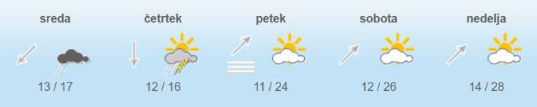 Najnižje jutranje temperature bodo od 8 do 12, na Primorskem do 15, najvišje dnevne od 13 do 19, na Primorskem okoli 22 stopinj Celzija.